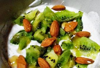Mezclamos el quark con un chorrito de aroma de vainilla y canela al gusto (puede añadirse también un poco de edulcorante si se quiere más dulce). Por encima ponemos un kiwi en trocitos, almendras naturales y una cucharadita de miel.