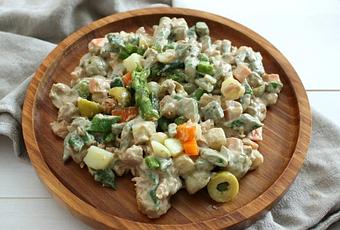 - Cuando las verduras y la mayonesa estén frías, acabar de preparar la ensaladilla: Mezclar las verduras y las patatas en una fuente de cristal. Agregar aceitunas verdes al gusto (partidas por la mitad) y la caballa bien troceadita. Por último, añadir mayonesa al gusto y mezclar todo junto.