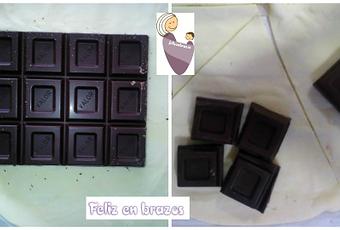 - Desenrollar la masa en su totalidad. En el centro colocaremos la tableta de chocolate completa. También podemos colocar el chocolate a trocitos, para dejarlo más repartido. Yo lo hago con chocolate negro, pero se puede hacer con cualquier tipo de chocolate.