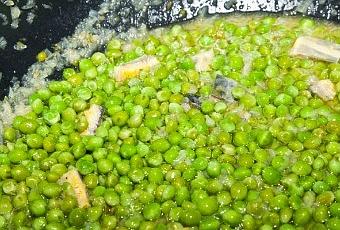 Paso 3: rehogamos unos minutos y añadimos los guisantes (si son frescos). Sí son guisantes congelados, basta con que los echemos tres o cuatro minutos antes de que los chocos estén tiernos.