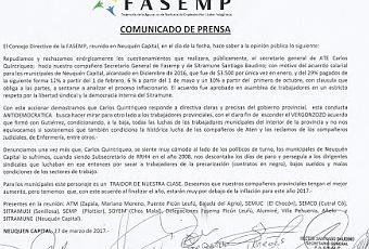 El Consejo Directivo de Fasemp rechaza y repudia los dichos del secretario general de ATE, Carlos Quintriqueo, quien cuestionó al secretario general de Sitramune, Santiago Baudino, y al acuerdo salarial alcanzado por los municipales de Neuquén capital, en diciembre de 2016.(Ver comunicado adjunto)