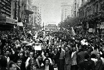 Avenida 18 de Julio, Montevideo. 17 de julio de 1950. Disponible en: Centro de fotografía de Montevideo http://cdf.montevideo.gub.uy/buscar/fotos/Festejo%20en%2018%20de%20julio?filters=anio%3A1950