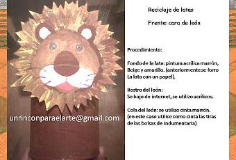 Utilizamos una lata de café; la forramos con papel madera y luego la pintamos con acrílicos marrón, amarillo y beige.La cara del león, la imprimimos desde Internet (van a google, imágenes, y buscan cara, rostros de león infantil; ahí tienen mucha opciones).Por ultimo la cola: se utilizo cinta (en mi caso utilice las cintas de las bolsas de indumentaria)