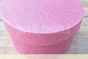 Necesitamos una caja de cartón redonda de cualquier cosa (bombones, galletas, pastas...), goma eva del color que más nos guste (yo he escogido una de color rosa con brillantina), lápiz para marcar, una regla, tijeras y pistola de silicona caliente.