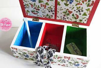 Lo dejamos secar y comenzamos a pintar el interior de la caja, nos pareció muy divertido pintar cada uno de los compartimentos de un color distinto, así que buscamos colores que fueran bien con la servilleta utilizada en el decoupage y así nos quedó, ¿os gusta?