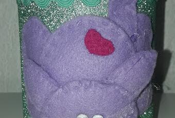 Hoy os traemos una manualidad reciclada. Un gatito hecho con fieltro... una lata de Nesquik, un trozo de papel adhesivo de purpurina y un restito de piquillo...
