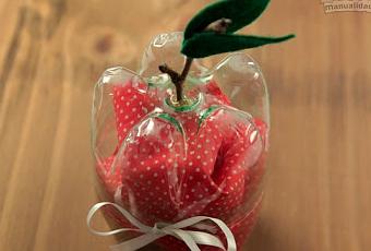 Fijaos qué reciclaje tan bonito y fácil de hacer hemos encontrado en la red!! Se trata de reciclar botellas de plástico y convertirlas en un portaregalos muy bonito con forma de manzana.
