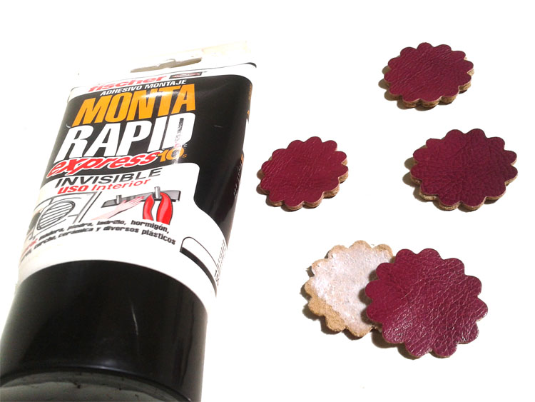 Montamos las piezas una sobre la otra, pegamos con el adhesivo e incrustamos las tachuelas con las tenazas.Glue them together with strong adhesive and add studs with your pliers.