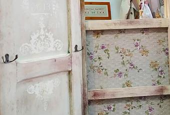 A. queria un espacio donde colgar pendientes y collares, así que coloque un espejo en el primer vano y tela de gallinero en los otros dos, donde enganchar los pendientes. Además coloque ganchos donde colgar collares y pulseras.Mrs. Crafter