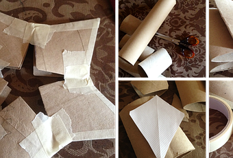 Para ello, aplastamos 5 rollitos de papel higiénico y dibujamos un rombo ,y los cortamos.Se unen con cinta de carrocero en forma de estrella.