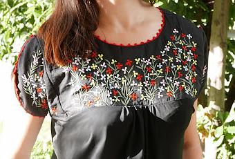 Aquí os presento la primera, aprovechando el canesú y combinando con una tela negra para darle más ligereza, la tela tiene algo más de caída y es más agradable de llevar. De mi cosecha, unos pequeños fruncidos en la parte central.