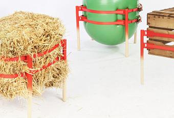 Desde pelotas de goma para gimnasia, hasta cajas de madera, troncos de leña, periódicos plegados, fardos de paja e incluso un montón de peluches apilados. Cuatro patas de madera y unas hebillas ajustables son la base de estos taburetes, firmes y resistentes, una estructura capaz de adaptarse a múltiples formas y tamaños, tantas como tú imagines.
