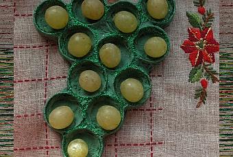 En primer lugar se pegan los tapones a un cartón en forma de racimo de uva. Una vez que se haya secado el pegamento comenzaremos a aplicar el papel higiénico ayudados de un pincel y de una mezcla de cola y agua, es decir, con la técnica del papel maché conseguiremos que unos feos tapones de plásticos se conviertan en un bonito recipiente para nuestras uvas.