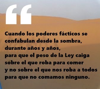 Cuando los poderes fácticos se confabulan desde la sombra, durante años y años, para que el peso de la Ley caiga sobre el que roba para comer y no sobre el que nos roba a todos para que no comamos ninguno... Cuando aumentan un 24% los millonarios (considerados los propietarios de más de unos 39 millones de euros) sólo en el último año y tarde en bajar el paro poco más de un 1% desde 2011 a 2014. Supone que pase quien pase por el poder no cambia el statu quo de los de arriba y mucho menos de los cada vez más “fuera del sistema”...Cuando tenemos que acudir a nuestros vecinos europeos del norte para que obliguen a nuestros gobernantes a ejecutar lo que ellos no se atreven (como tantas y tantas sentencias de David contra Goliath frente a la triada capitolina de Constructores-Políticos-Bancarios)... Cuando los del sur nos piden ayuda a gritos en forma de intentos masivos de entrada... Cuando los de al lado se han quedado sin nada y lo único que nos importa es no acabar como ellos...