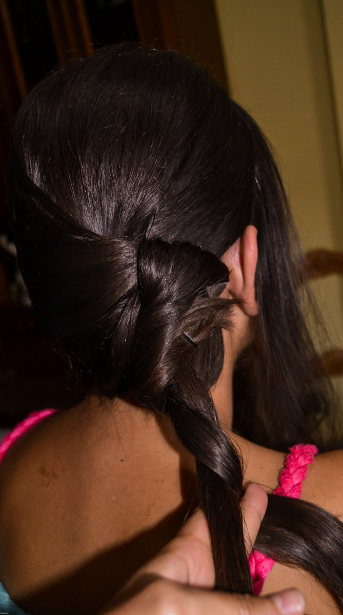 Retorcemos el cordón y lo enrollamos sobre la base que hemos creado, sujetamos bien con ganchos de clip y enlacamos bien el cabello para que se quede fijado.