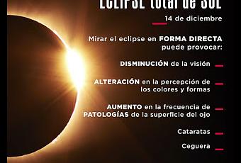 El eclipse solar se producirá el próximo 14 de diciembre en Ecuador, Perú, Bolivia, Chile, Argentina, Uruguay, Brasil, Paraguay y los océanos adyacentes, y dado que Neuquén será una de las provincias en la que podrá ser visto, desde el Ministerio de Salud de la provincia se recuerda la importancia de las medidas de prevención para observar el fenómeno astronómico de manera segura y así evitar lesiones oculares.