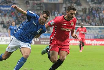 El encuentro comenzó con los dos equipos estudiándose, sin plantearse el objetivo principal de este deporte -el anotar goles- en una nada que avivaba los malos augurios que los azules habían dejado tras su choque soriano. Fue Koné el primero de los locales que remató, a los once minutos, para, diez después, culminar una gran jugada por banda. Los de Egea fueron despertando poco a poco de su letargo y comenzaron a combinar, a desdoblarse por las bandas y a crear peligro. Los catalanes apenas inquietaban, con un fútbol en segunda velocidad, extremadamente lento, que favorecía los intereses ovetenses. Sólo alteró el guión no escrito De la Espada con un remate al larguero, más fruto de ciertos desarreglos en las marcas, que de una iniciativa organizada. Casi al final, Susaeta anotaba su tercer tanto de falta, el sexto de una campaña donde está mostrando un enorme acierto y confianza. Con el segundo, la alegría del once azul propiciaba más peligro para los ramplones catalanes que no mostraron casi nada positivo a lo largo del partido.