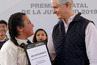 Tultitlán, Estado de México.- El Gobernador Alfredo Del Mazo Maza entregó el Premio Estatal de la Juventud a 30 mexiquenses, a quienes calificó como jóvenes destacados, talentosos y que son un motivo de inspiración y ejemplo para las futuras generaciones, además de que ponen el nombre del Estado de México en alto.