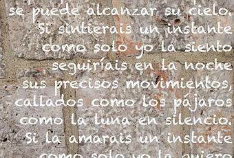 Si la vierais un instantecomo solo yo la veodejaríais de decirpalabras en el momentoporque solo con suspirosse puede alcanzar su cielo.Si sintierais un instantecomo solo yo la sientoseguiríais en la nochesus precisos movimientos,callados como los pájaroscomo la luna en silencio.Si la amarais un instantecomo solo yo la quierodejaríais de comerde beber y de moverosesperando que sus labiosdevuelvan por fin un beso.