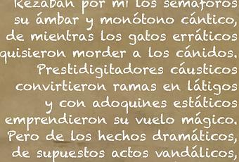 La noche del pasado sábadovolaban atentos los pájaros,los árboles crecieron rápidoy el cielo palideció lánguido.Rezaban por mí los semáforossu ámbar y monótono cántico,de mientras los gatos erráticosquisieron morder a los cánidos.Prestidigitadores cáusticosconvirtieron ramas en látigosy con adoquines estáticosemprendieron su vuelo mágico.Pero de los hechos dramáticos,de supuestos actos vandálicos,ni de unos canallas fanáticossé nada. De respuesta un viáticode mi canciller diplomático.