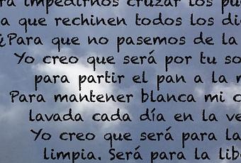 ¿Para quien moriré en esta batalla?¿Para quién son mis brazos incipientes,mi boca y mis oídos aun ausentesde mentira? ¿Para qué se me calla?¿Será para que hable la metralla?¿Para impedirnos cruzar los puentes?¿Para que rechinen todos los dientes?¿Para que no pasemos de la raya?Yo creo que será por tu sonrisa,para partir el pan a la mitad.Para mantener blanca mi camisalavada cada día en la verdad.Yo creo que será para la brisalimpia. Será para la libertad.