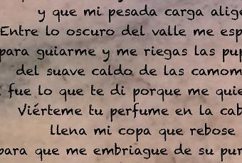 y que mi pesada carga aligeras.Entre lo oscuro del valle me esperaspara guiarme y me riegas las pupilasdel suave caldo de las camomilas.¿Qué fue lo que te di porque me quieras?Viérteme tu perfume en la cabeza,llena mi copa que rebose vinopara que me embriague de su pureza.Ven, acompáñame por el caminoque nada temeré de la malezasi tu cayado guía mi destino.