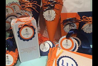 recordatorio comunión, en raya azul, decorado en naranja y niño cadete