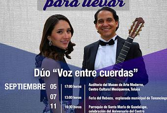 Toluca, Estado de México.-El dúo “Voz entre Cuerdas”, que se ha presentado en diversos escenarios de México y el extranjero, llevará, durante el mes de septiembre, su música a diversos municipios con su gira “Música para llevar”.