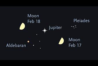 Un poco a la derecha de Júpiter hay un pequeño grupo de estrellas llamado las Pléyades (o, a veces, las Siete Hermanas). Estas estrellas fueron formadas todas juntas hace, aproximadamente 100 mil millones de años. Justo un poquito a la izquierda de Júpiter está la radiante estrella Aldebarán, marcando el enfadado ojo de Tauro, el Toro.Otro radiante planeta, Mercurio, es visible sobre la mitad de febrero. Búscalo comenzando sobre las 9 o 10, abajo en el oeste mientras el crepúsculo oscurece. Observa donde el Sol se pone, y entonces mira justo encima, al de aproximadamente 45 minutos después, es esa mancha.Brota en el este, busca el cinturón distintivo de Orión, un trío de estrellas que forman una hilera diagonal. A la izquierda, en lo más alto del cinturón está Betelgeuse, y a la derecha, en la parte inferior, está el diamante azul blanquecino llamado Rigel.Febrero podría ser frío donde tú vives, pero sus atardeceres ofrecen muchos impresionantes cielos nocturnos. Puedes buscarlas mediante el audio que puedes encontrar en el artículo original.