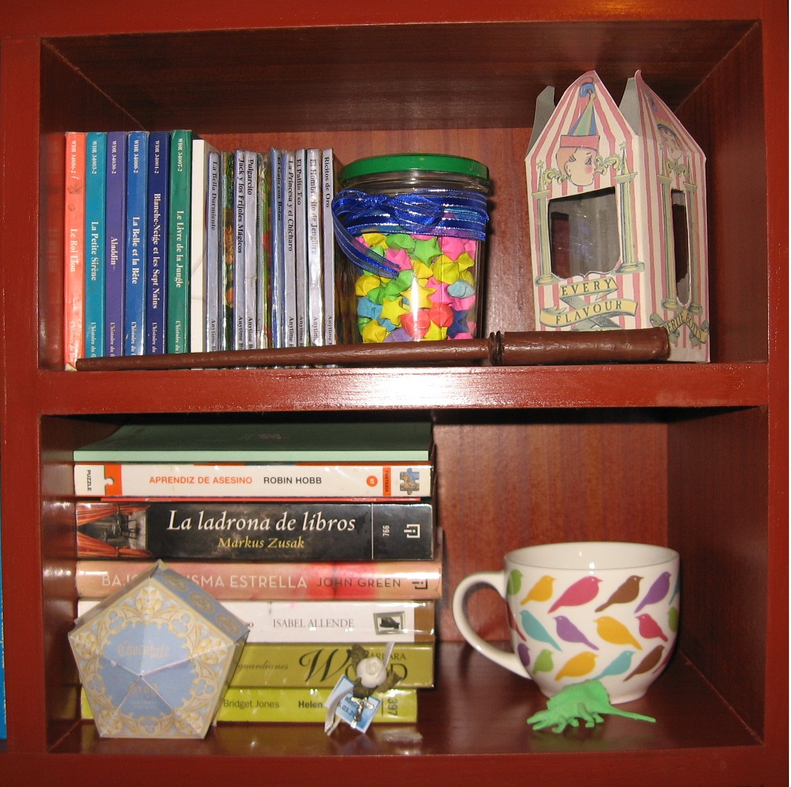 Como ven, en la parte de arriba están los libros más pequeños que son infantiles principalmente, también encontramos un tarro de vidrio con estrellitas de papel que hice en una época en la que tenía mucho tiempo evidentemente, también hay una caja de grajeas de todos los sabores que hice siguiendo un tutorial y en el que guardo monedas y como ven está bastante vacío, y finalmente está mi varita, la hice siguiendo las características de mi varita en Pottermore. En la parte de abajo hay una torre de libros que puse ahi porque tenían más o menos el mismo tamaño, también está mi taza del TBR Jar Challenge, un dinosaurio de los que crecen cuando los metes en el agua (cuando lo puse en la estantería estaba unas veinte veces más grande que ahora pero se encogió), una flor pequeña de mentira que fue un recuerdo de un retiro al que fue mi papá y finalmente una caja de ranas de chocolate que está bastante desteñida pero que hice yo siguiendo otro tutorial y en la que guardo los papeles de libros que me van tocando en el TBR Jar Challenge y que ya he leído.