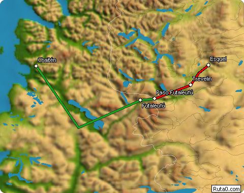 Hoy, los 35 km de Trevelin hasta el Paso fronterizo están pavimentados.. . . En el trayecto hacia Futaleufú, la Naturaleza acompaña, con sus múltiples verdes, sonoras cascadas y densos bosques para hacer del viaje algo inolvidable. . .Desde Futaleufú hasta Chaitén, Provincia de Palena, X Región de Los lagos, Chile