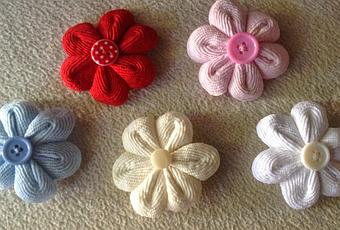 Y empezaremos por estas margaritas hechas con piquillo, zigzag, tripa de pollo, sandunga... como queráis llamarlo. Las podéis pegar a una pinzita o coserle un coletero.