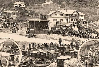 Recuerdo de papel en doble página que Goñi retrató para Nuevo Mundo. Visión de Navacerrada y su Club Alpino Español, precioso chalet de El Ventorrillo, durante la celebración de la Carrera automovilista de la Cuesta de Navacerrada el domingo 31 de mayo de 1914.Junto al Club la tribuna Regia, instalada para la ocasión, desde donde Alfonso XIII observaba las maniobras de los bólidos. El resto de la escena, una composición perfecta de carromatos y personas congeladas en el tiempo; incluido el polvo de la carretera.