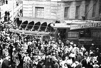 Vuelco de tranvía con trágicas consecuencias al que asisten muchos curiosos. El tranvía motor empotrado en el escaparate de una tienda de la calle Barquillo esquina a la de Belén, y la jardinera, desmayada sobre la ochava, provocaron un muerto y diez heridos.