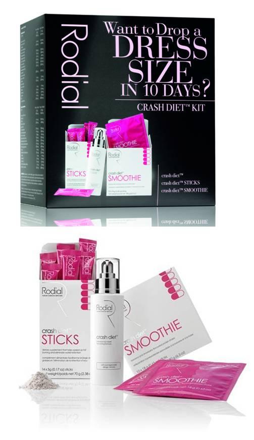 CRASH DIET STICKS son unos sobres solubles en agua que estimulan el metabolismo para quemar la grasa y eliminar la retención de líquidos. Para ello se componen de rabito de cereza, reina de los prados y extracto de hoja de fresno que eliminan los residuos y toxinas acumuladas; extracto seco de semilla de café verde, rico en ácido cloragénico que reduce la absorción de glucosa; guaraná para acelerar el proceso de lipólisis; y extracto seco de hoja de té verde para retrasar la absorción de grasa. Con su sabor a melocotón es perfecto para refrescarse y tomarlo en cualquier momento. CRASH DIET SMOOTHIES son los batidos de Rodial con menos de 100 calorías en cada bolsita. Son ideales para sustituir una comida diaria gracias a su alto contenido en proteínas para proporcionar al organismo toda la energía que necesita. Con su delicioso sabor a batido de fresas y plátano se puede mezclar con agua, leche desnatada o de soja e incluso con zumo. CRASH DIET GEL es una solución que elimina la grasa incluso de las zonas más rebeldes. Un gel escultor que reduce la retención de líquidos y ayuda a definir la silueta del cuerpo. En su fórmula se encuentran el Redulite que elimina el agua acumulada en los tejidos favoreciendo el drénate, y Isoslim Complex, una combinación de activos que trabaja en sinergia para lograr una piel más densa y trabajar sobre el metabolismo para reducir la cantidad de tejido graso. P.V.P Kit: 109 €. De venta en El Corte Inglés y en perfumerías especializadas. www.rodial.co.uk