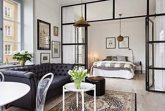 Pero es quizás el cerramiento del dormitorio el elemento que mayor sensación de amplitud visual genera. No es la primera vez que vemos este tipo de división con puertas y ventanas de estética industrial en una vivienda. Lo cierto es que esta tendencia ha irrumpido con fuerza en la decoración.En definitiva el cerramiento del dormitorio acristalandolo es un gran acierto, ya que se convierte en la solución perfecta para dividir el espacio de manera funcional sin perder amplitud visual y dotando al apartamento de un concepto unificador. Además cuando necesitemos intimidad siempre podemos correr las cortinas interiores..........una gran idea.
