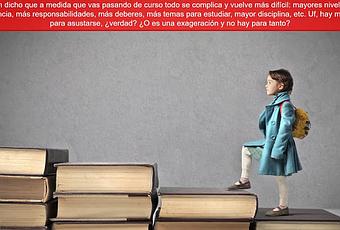Ya se acerca un nuevo curso y Ainhoa está muy angustiada, La niña va a comenzar las clases en un grado superior y le han dicho que a medida que vas pasando de curso todo se complica y vuelve más difícil: mayores niveles de exigencia, más responsabilidades, más deberes, más temas para estudiar, mayor disciplina, etc. Uf, hay motivos para asustarse, ¿verdad? ¿O es una exageración y no hay para tanto?