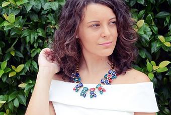 El look de hoy es bicolor, una mezcla de rojo y blanco. Para la ocasión una falda con vuelo y un top con hombros al aire.Como complementos un precioso collar combinado, unas sandalias de tacón ancho y un bolso tipo bowling en blanco.