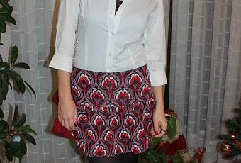 Llevo falda de Pull&Bear en tonos rojos, camisa básica blanca de Zara y debajo un top lencero de tirantes de Stradivarius.No tenía claro si ponerme stilettos o botas por encima de la rodilla y al final para dar un aire menos serio me decanté por las botas (Zara).Maquillaje con labios rojos y eyerline muy marcado. En el pelo un semirecogido con ondas que me hizo mi peluquera y amiga, Amanda.
