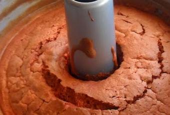 - Sacar del horno y dejar boca abajo durante 1 hora (si no tienes un molde angel tan solo tendras que poner una rejilla de horno sobre vasos y poner encima el molde boca abajo.
