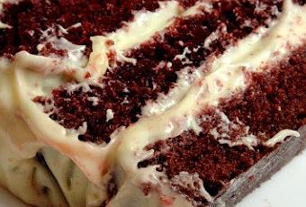 - Bizcocho: Mezclar en un bol 280 grs. de harina, 1 cuch. de cacao en polvo, 1 cdta. de levadura en polvo y 1 cdta. de bicarbonato. Reservar. Batir 125 grs. de mantequilla a punto pomada con 250 grs. de azúcar. Añadir 2 huevos, 1 cuch. de esencia de vainilla y colorante rojo líquido. Añadir un tercio de la mezcla de harina y seguir batiendo. Añadir la mitad del buttermilk y batir. Otra parte de la mezcla de harina, el resto del buttermilk y el resto de la harina. Batir todo bien y verter en dos moldes engrasados de 16 cm. de diámetro. Hornear a 180º unos 40´. Dejar enfriar y cortar por la mitad cada uno para rellenar.