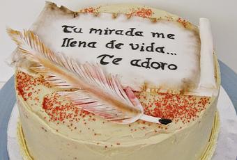 La tarta es una Red Velvet rellena de crema de queso y cubierta toda de ganaché de chocolate blanco.