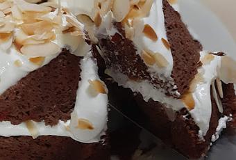 3 huevos grandes (o 4 medianos) 200 g de harina de almendras 65 g de puré de remolacha 2 cucharadas de queso crema natural 80 g de azúcar de abedul o un endulzante similar Unas gotas de colorante rojo( opcional) 2 cucharaditas de polvo de hornear 2 cucharaditas de cacao en polvo Unas gotas de extracto de vainilla (en menor cantidad) Almendras fileteadas tostadas 8 cucharadas de queso crema 120 g de chocolate blanco