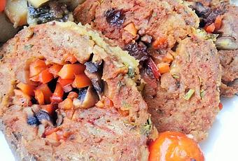 Redondo de seitán con diferente relleno y salsa de champiñones