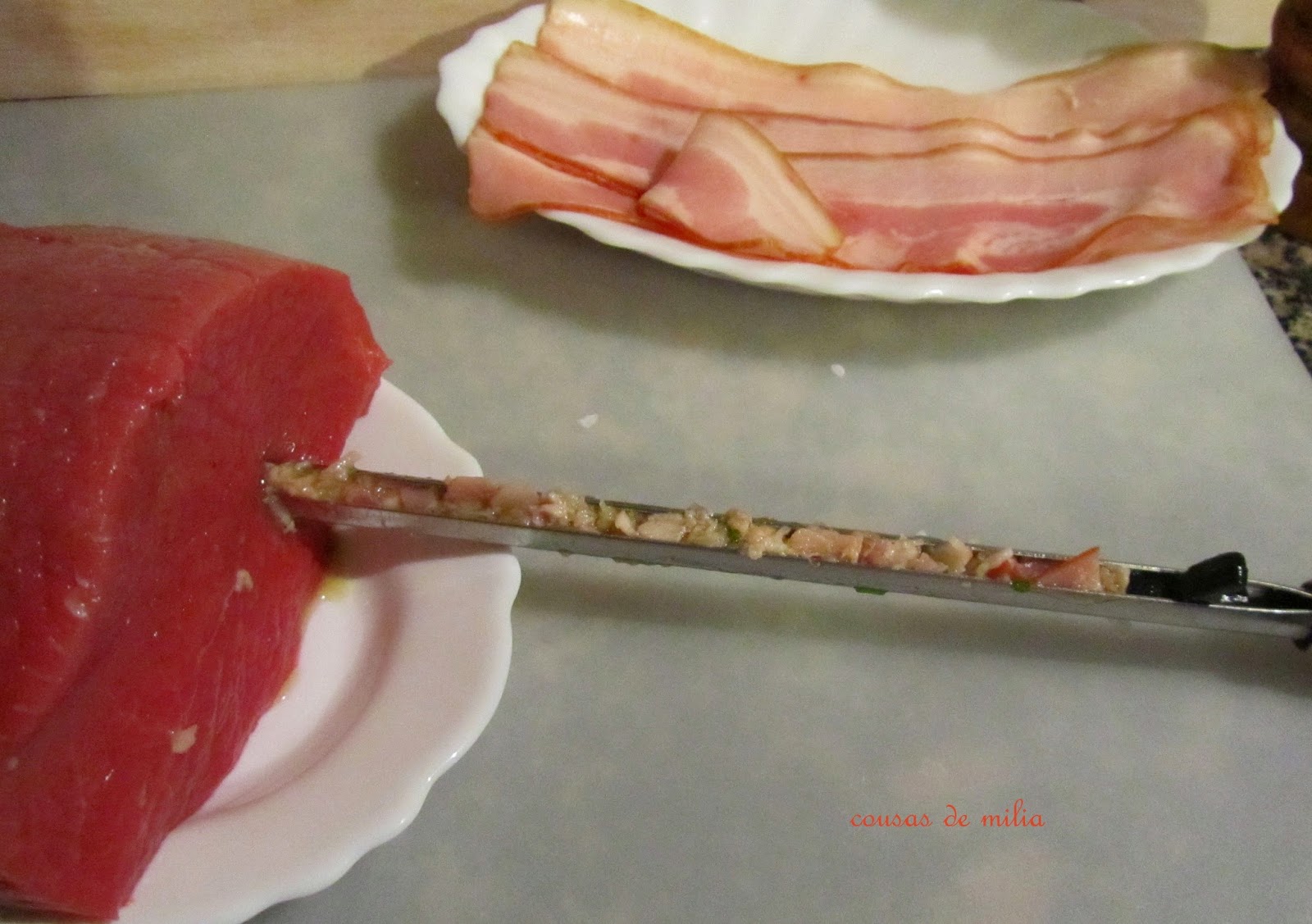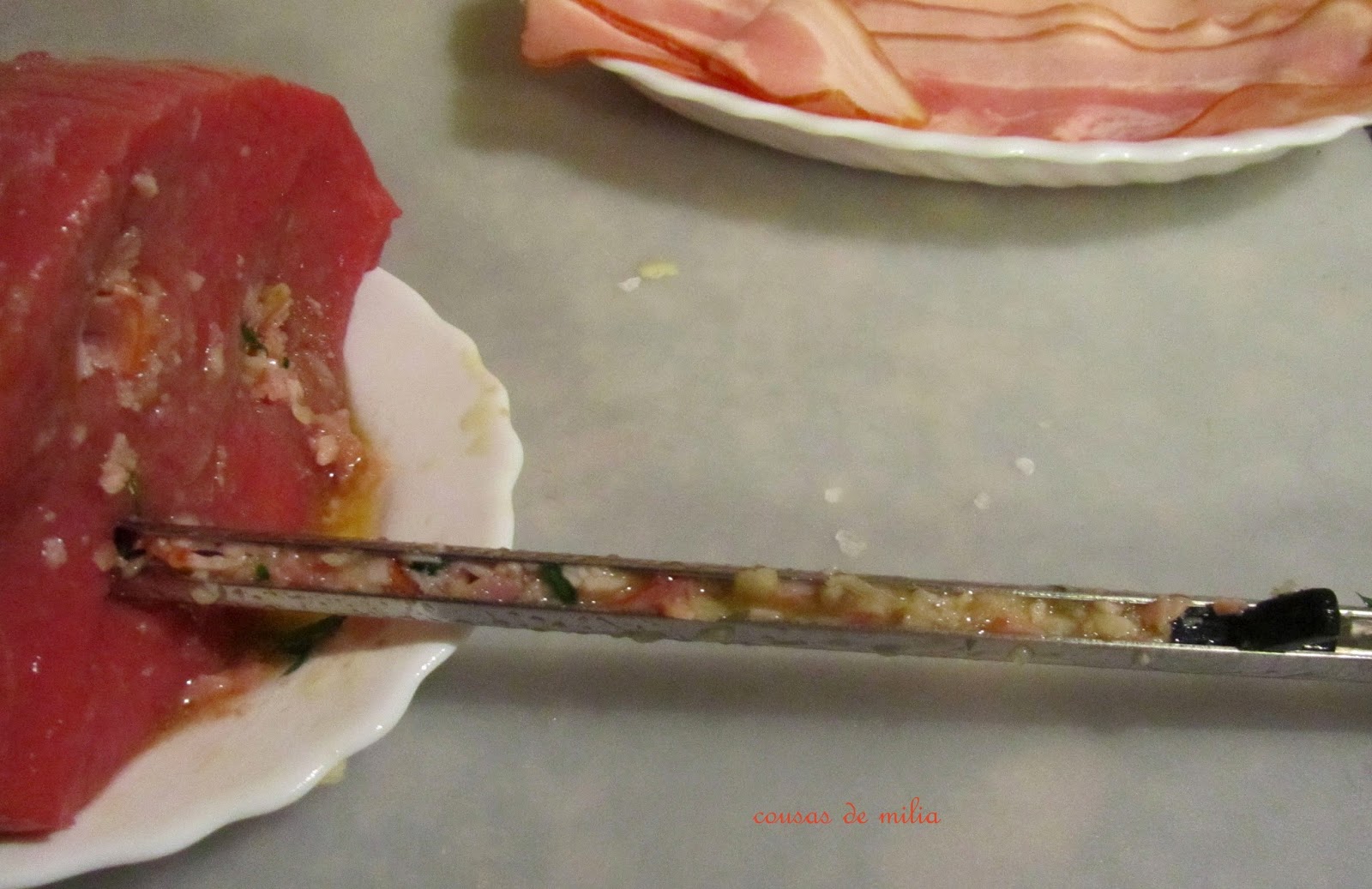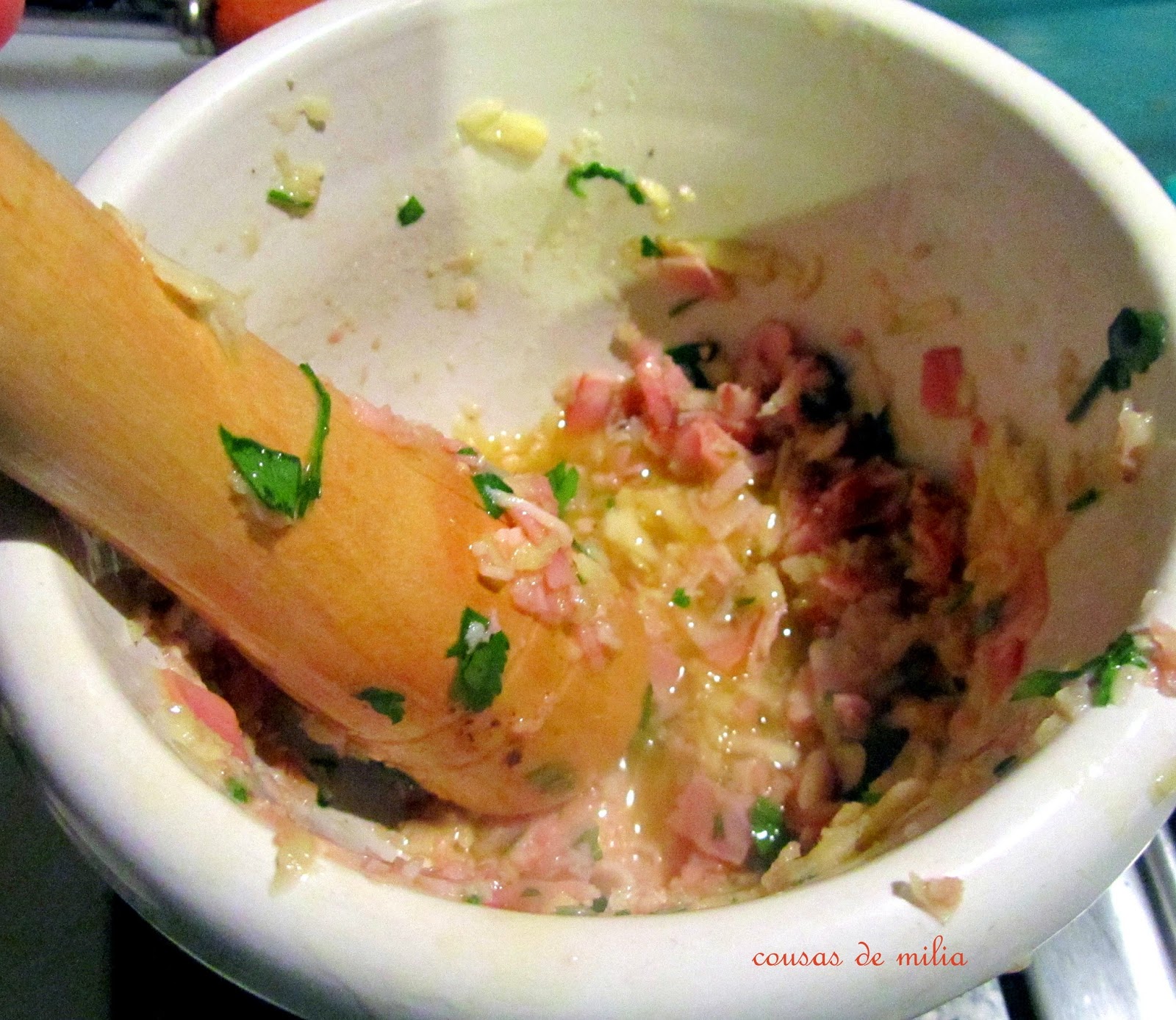 Unas horas antes, o la noche anterior: majamos los ajos con la sal, la pimienta, el perejil y el bacón picadito, le añadimos unas gotas de vinagre de Jerez y un chorrito de aceite de oliva virgen.
