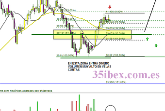 Creo que sobre los 39.20 podemos encontrar un buen apoyo y donde el precio puede rebotar. Coincidiría con el hipotético (aún no se ha producido) fibo50 del recorte de esta última subida y con el fibo 62 de la extensión de la última bajada fuerte. Otro punto serían los 38.60, por debajo de esto iríamos a buscar el origen del movimiento o incluso ya perderíamos la zona.