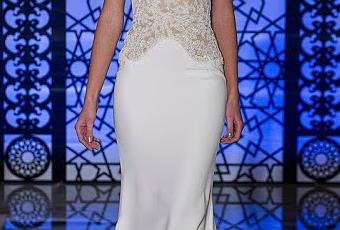 Reem Acra combina la Alta Costura tradicional con las nuevas tendencias que demandan las mujeres de hoy en día. Hay que prestar atención a los detalles de cada una de las propuestas, alguna con bordados perfectos, frente a los trajes de novia de dos piezas, compuestos por corpiños o blusas y falda, que resaltan la figura femenina.
