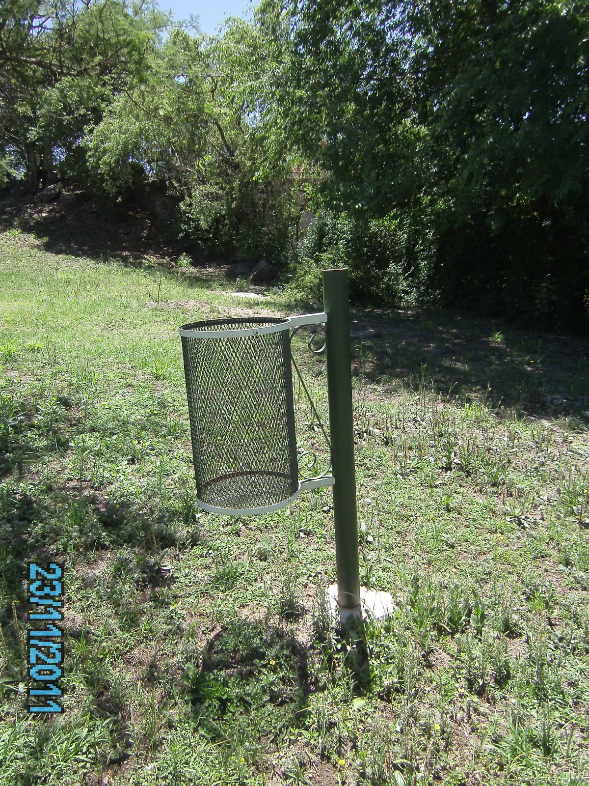 Cestos de basura de madera y metal observados en espacios públicos de mi país, República Argentina: