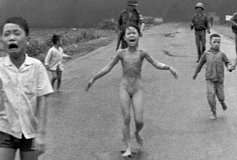 La primera instantánea fue disparada por Nick Ut y recoge la imagen de la niña huyendo despavorida, quemada por Napalm, durante el conflicto vietnamita.