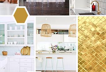 Lo primero ha sido crear un moodboard para analizar toda la inspiración (este paso es clave para obtener el resultado que queremos y no perdernos por el camino con mil ideas). Se ha optado por el uso de acabados actuales y piezas de tendencia: mucho blanco y algo de madera, subway tiles, isla con taburetes, estantes abiertos, lámparas colgantes, electrodomésticos de acero inoxidable, algo étnico y un toque vegetal.